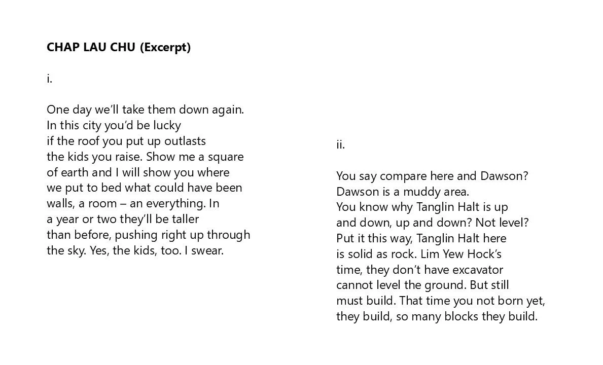 One poem where I try to capture these different voices over time is ‘Chap Lau Chu’, which takes its name from the ten-storey blocks that were a defining feature of the Tanglin Halt estate. The poem, which is in ten parts, alternates between what I think of as the voice of memory and recollection – the voice of the poet – and another voice which hews more closely to the residents’ own, collected through oral history interviews before they moved out. I wanted this poem to be a microcosm of the book, to contain a cacophony of voices that defy the idea of a single Tanglin Halt narrative.